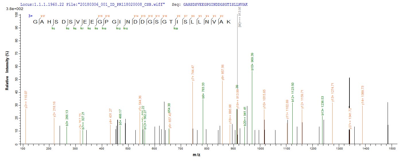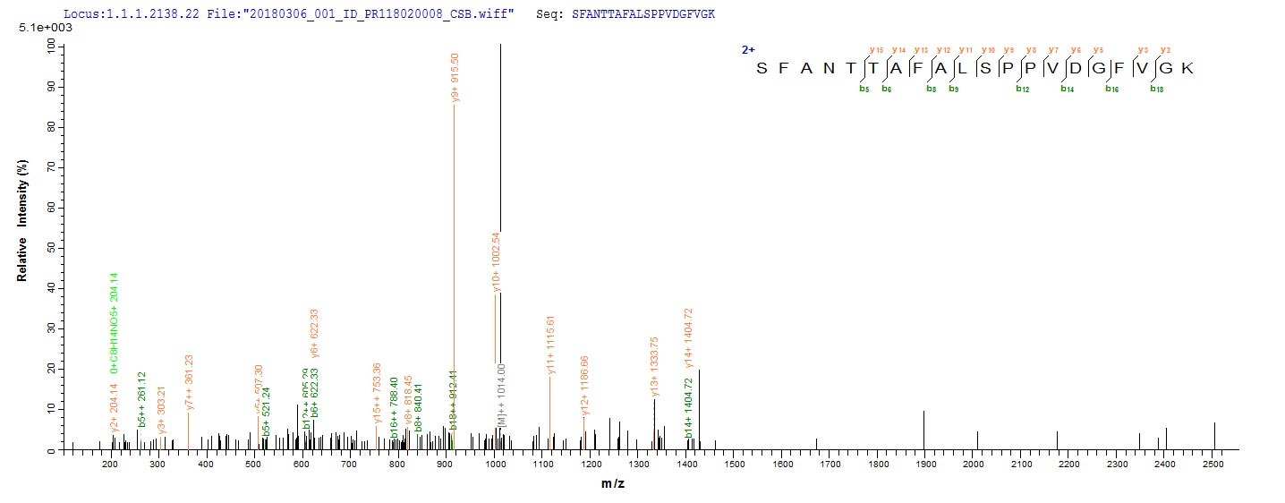 Based on the SEQUEST from database of E.coli host and target protein, the LC-MS/MS Analysis result of CSB-EP339800SVG could indicate that this peptide derived from E.coli-expressed Saccharomyces cerevisiae (strain ATCC 204508 / S288c) (Baker's yeast) APE3.