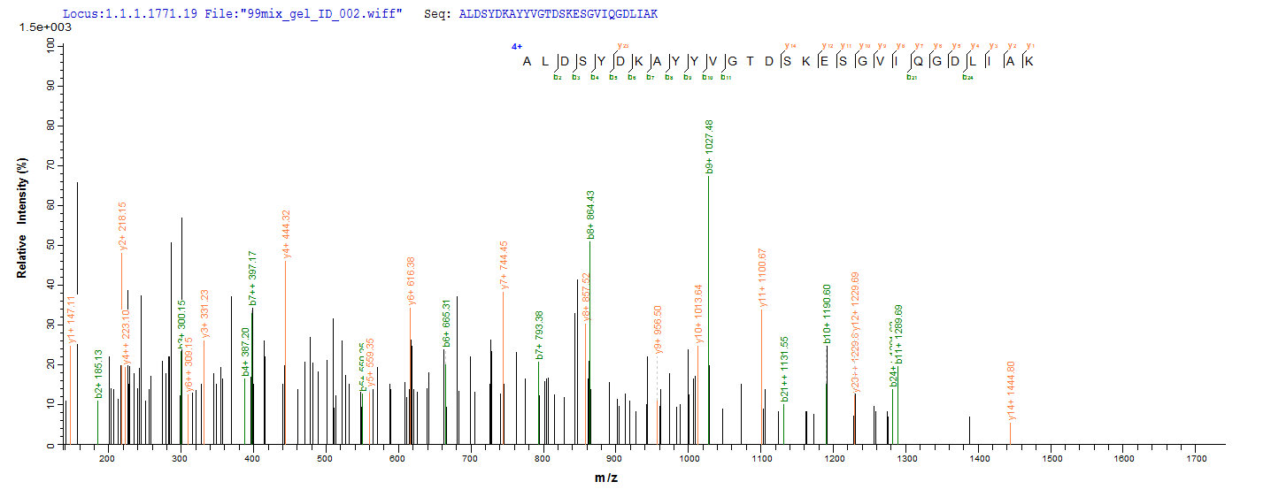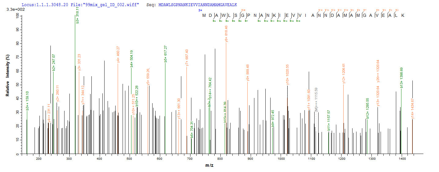 Based on the SEQUEST from database of Yeast host and target protein, the LC-MS/MS Analysis result of CSB-YP326441SXB could indicate that this peptide derived from Yeast-expressed Salmonella typhimurium (strain LT2 / SGSC1412 / ATCC 700720) mglB.