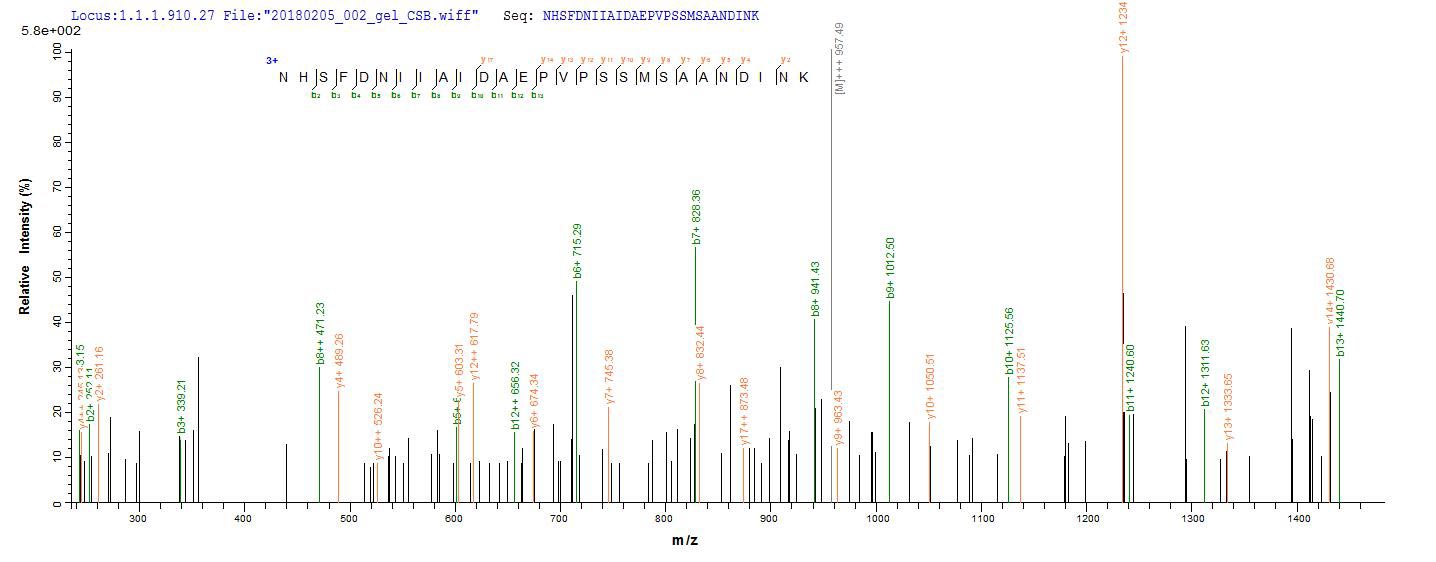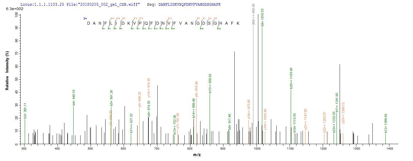 Based on the SEQUEST from database of E.coli host and target protein, the LC-MS/MS Analysis result of CSB-EP892561SXV could indicate that this peptide derived from E.coli-expressed Schizosaccharomyces pombe (strain 972 / ATCC 24843) (Fission yeast) fap2.