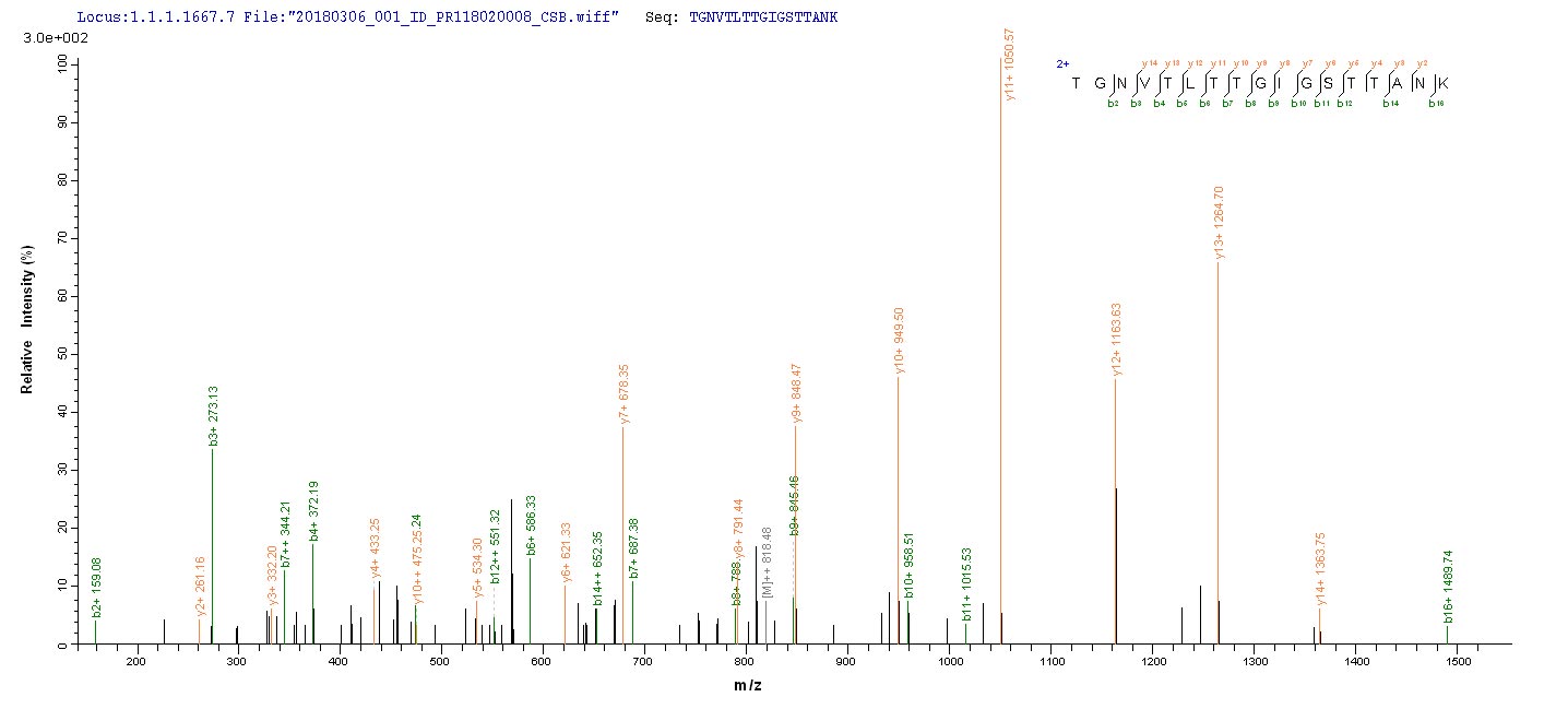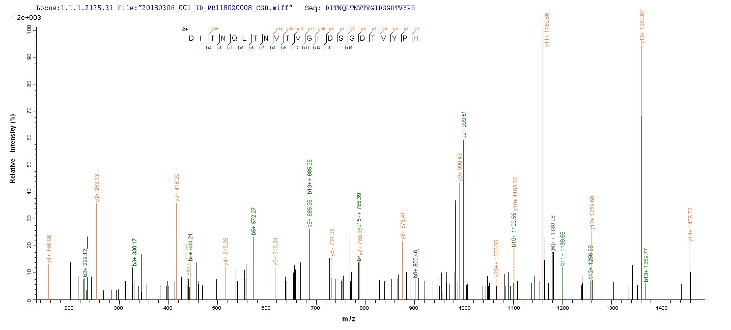 Based on the SEQUEST from database of E.coli host and target protein, the LC-MS/MS Analysis result of CSB-EP753416SKW could indicate that this peptide derived from E.coli-expressed Staphylococcus aureus (strain MSSA476) clfA.