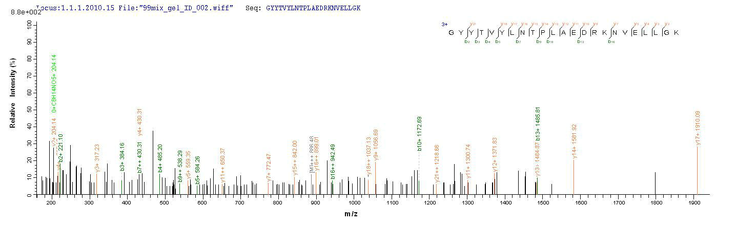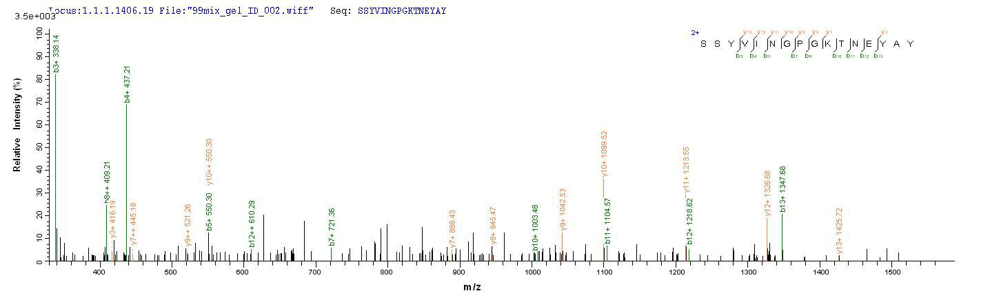 Based on the SEQUEST from database of Yeast host and target protein, the LC-MS/MS Analysis result of CSB-YP746696SKV could indicate that this peptide derived from Yeast-expressed Staphylococcus aureus (strain MRSA252) chp.