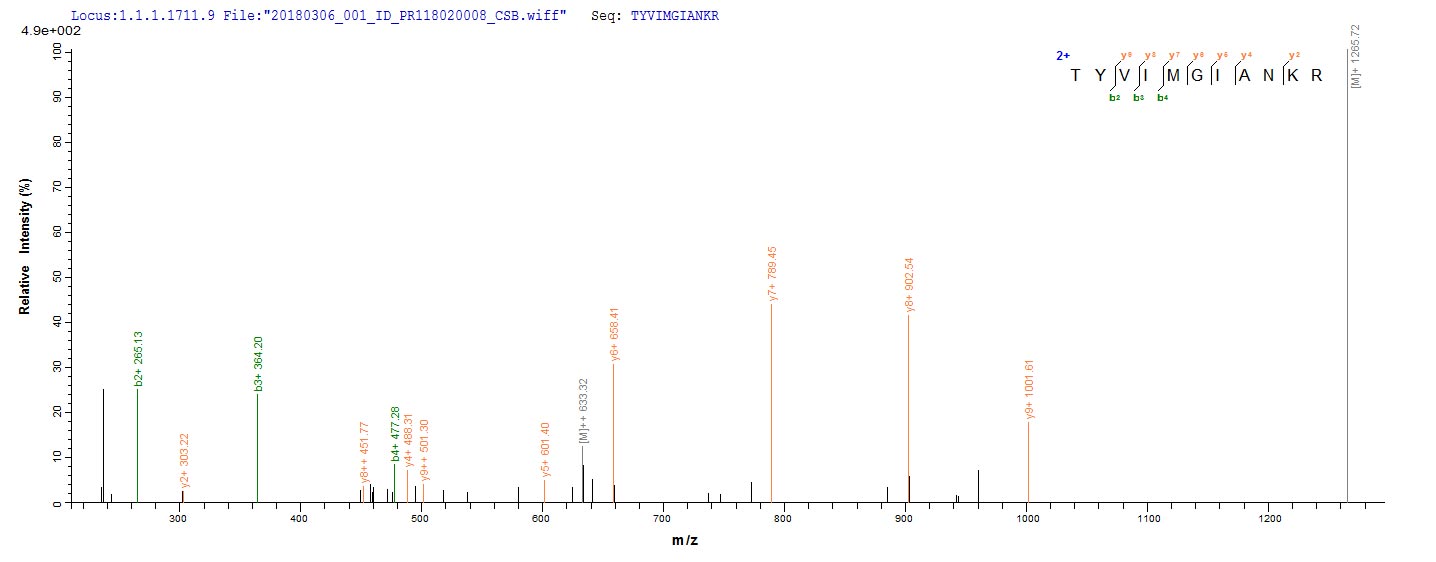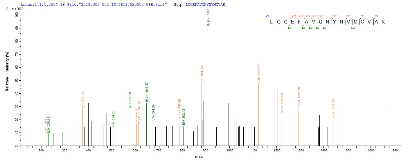 Based on the SEQUEST from database of E.coli host and target protein, the LC-MS/MS Analysis result of CSB-EP750140SKV could indicate that this peptide derived from E.coli-expressed Staphylococcus aureus (strain MRSA252) fabI.