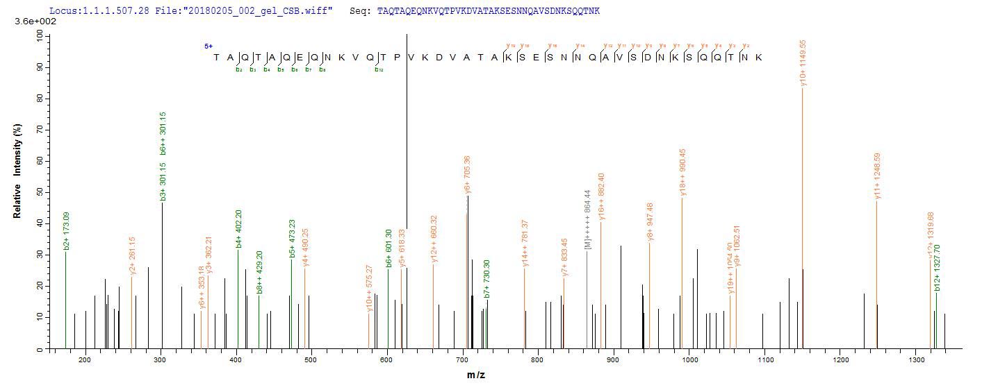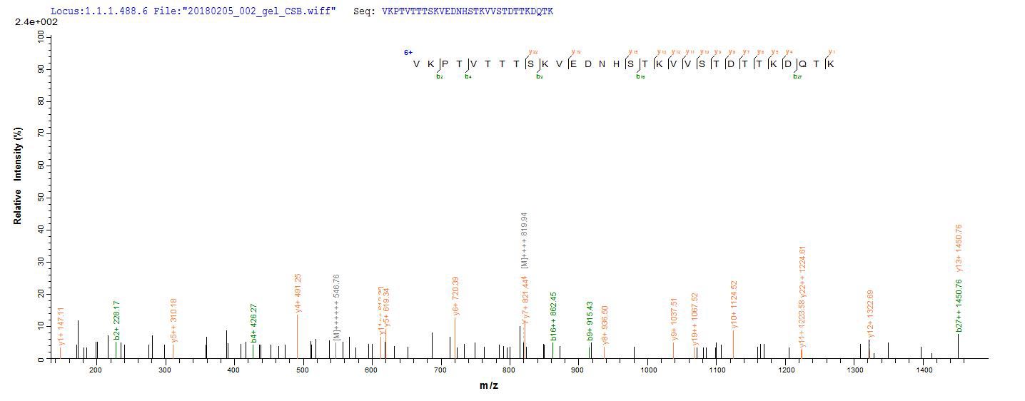Based on the SEQUEST from database of E.coli host and target protein, the LC-MS/MS Analysis result of CSB-EP763937SKW could indicate that this peptide derived from E.coli-expressed Staphylococcus aureus (strain MSSA476) isdA.