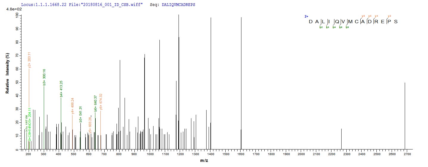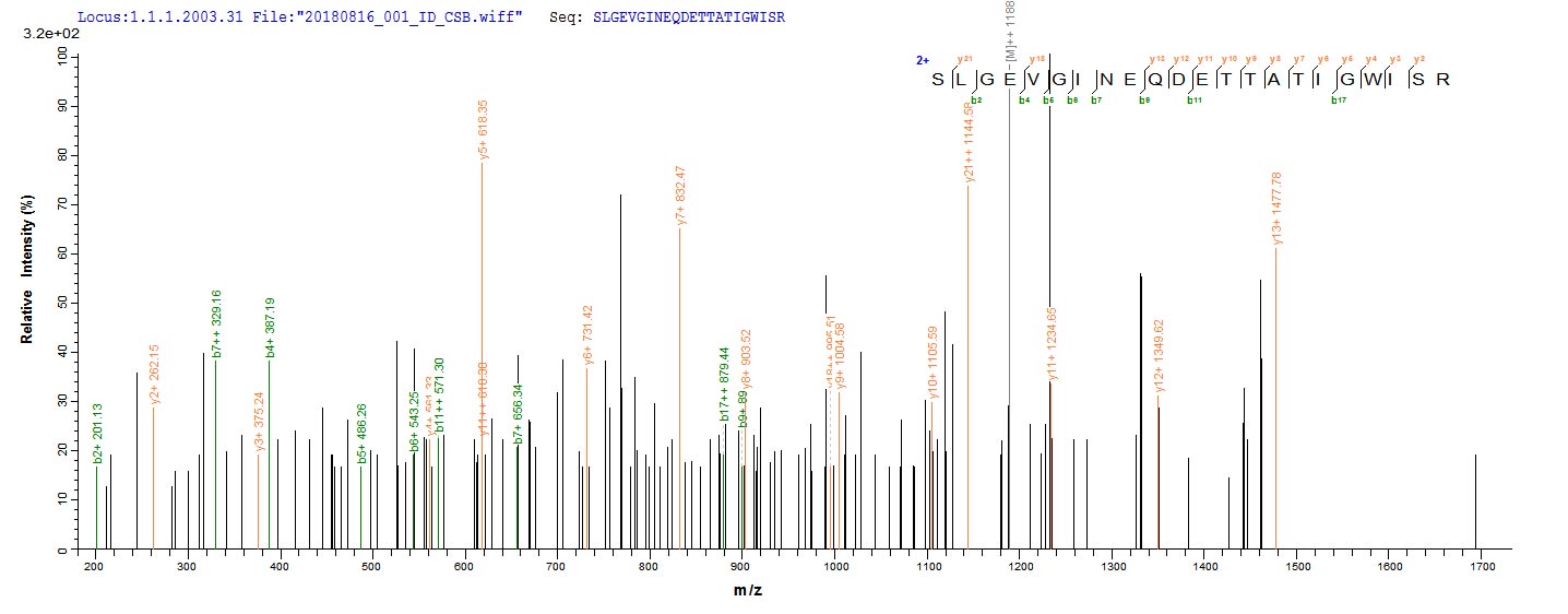 Based on the SEQUEST from database of E.coli host and target protein, the LC-MS/MS Analysis result of CSB-EP528172TPR1 could indicate that this peptide derived from E.coli-expressed Treponema pallidum (strain Nichols) TP_0608.