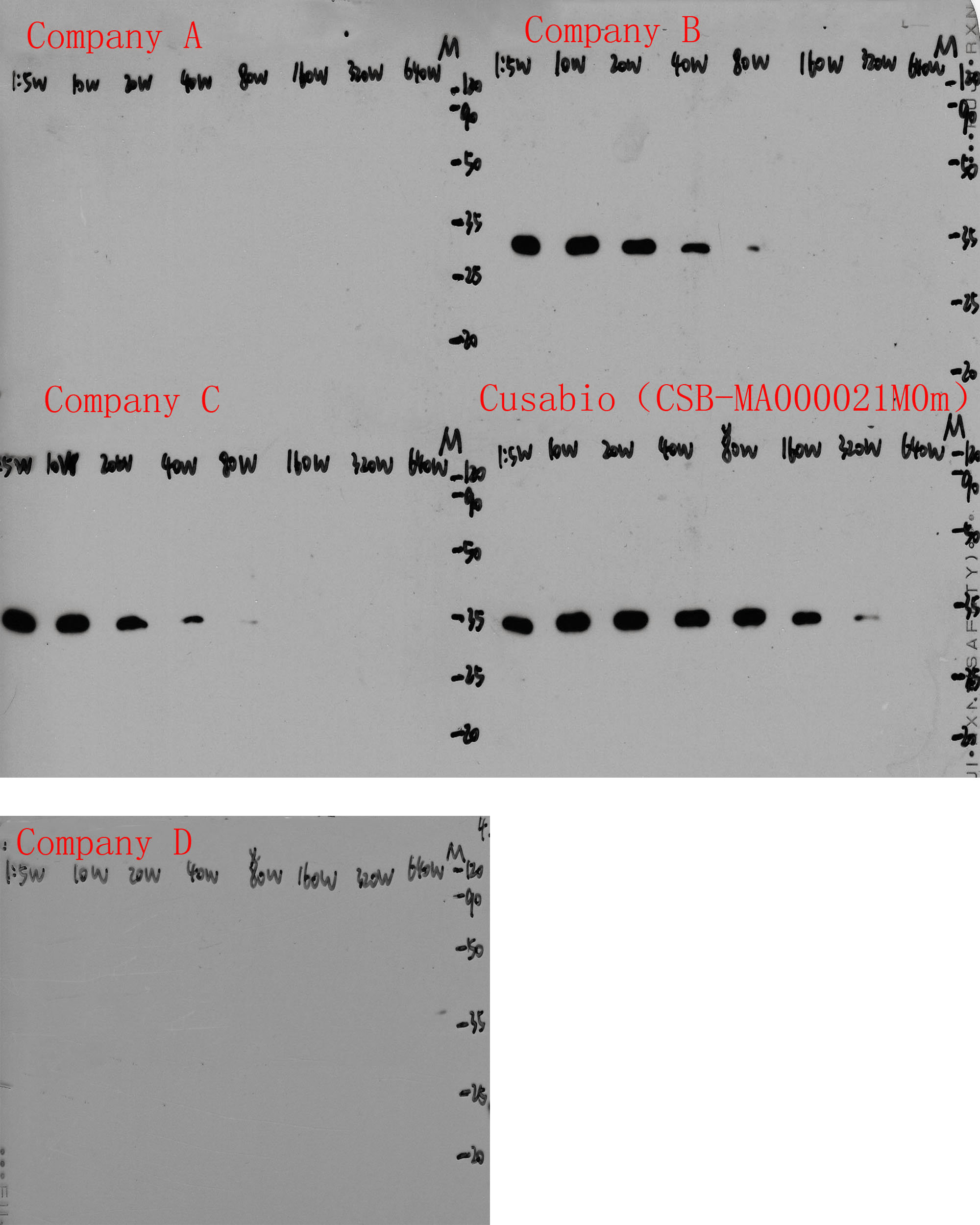 All lanes: Company A, Company B, Company C, Company D, CSB-MA000021M0m antibody at 1:50000, 1:100000, 1:200000, 1:400000, 1:800000, 1:1600000, 1:3200000, 1:6400000