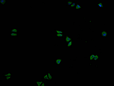 Immunofluorescence staining of Hela cells with(CSB-MA000071M1m)at 1:50, counter-stained with DAPI. The cells were fixed in 4% formaldehyde, permeabilized using 0.2% Triton X-100 and blocked in 10% normal Goat Serum. The cells were then incubated with the antibody overnight at 4°C. Nuclear DNA was labeled in blue with DAPI. The secondary antibody was FITC-conjugated AffiniPure Goat Anti-Mouse IgG (H+L).