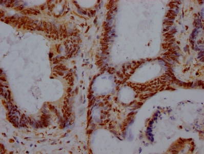 IHC image of CSB-MA000071M1m diluted at 1:500 and staining in paraffin-embedded human colon cancer performed on a Leica BondTM system. After dewaxing and hydration, antigen retrieval was mediated by high pressure in a citrate buffer (pH 6.0). Section was blocked with 10% normal goat serum 30min at RT. Then primary antibody (1% BSA) was incubated at 4°C overnight. The primary is detected by a Goat anti-rabbit polymer IgG labeled by HRP and visualized using 0.05% DAB.