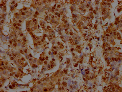 IHC image of CSB-MA000071M1m diluted at 1:500 and staining in paraffin-embedded human breast cancer performed on a Leica BondTM system. After dewaxing and hydration, antigen retrieval was mediated by high pressure in a citrate buffer (pH 6.0). Section was blocked with 10% normal goat serum 30min at RT. Then primary antibody (1% BSA) was incubated at 4°C overnight. The primary is detected by a Goat anti-rabbit polymer IgG labeled by HRP and visualized using 0.05% DAB.