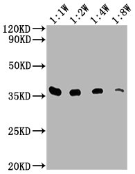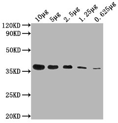 Positive WB detected in: Hela whole cell lysate at 10μg, 5μg, 2.5μg, 1.25μg, 0.625μg All lanes:GAPDH antibody at 1:5000