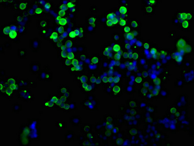 Immunofluorescence staining of transfected HEK293 cells with CSB-MA000041M0m at 1:100, counter-stained with DAPI. The cells were fixed in 4% formaldehyde, permeabilized using 0.2% Triton X-100 and blocked in 10% normal Goat Serum. The cells were then incubated with the antibody overnight at 4°C. The secondary antibody was Alexa Fluor 488-congugated AffiniPure Goat Anti-Mouse IgG(H+L).
