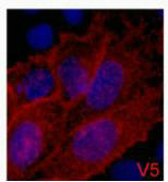 IF analysis of 293 cells transfected with a V5-tag protein,1:2000 dilution (blue DAPI, red anti-V5)