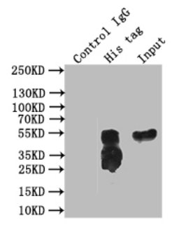 Lane 1: control IgG instead of 2F4B5 in 293 whole cell lysate transfected with His. Lane 2: 2F4B5 antibody (2μg) + 293 whole cell lysate transfected with His (500μg)