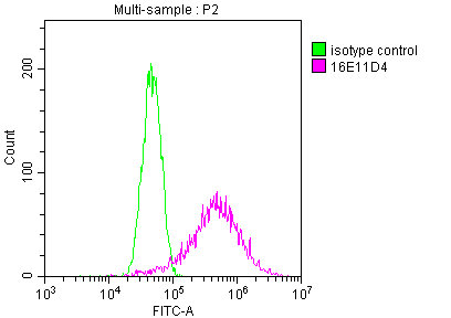 Overlay Peak curve showing A549 cells stained with CSB-MA025318A0m (red line) at 1:200. The cells were fixed in 4% formaldehyde and permeated by 0.2% TritonX-100. Then 10% normal goat serum was Incubated to block non-specific protein-protein interactions followed by the antibody (1μg/1*106cells) for 1 h at 4°C. The secondary antibody used was FITC-conjugated Goat Anti-Mouse IgG(H+L) at 1/100 dilution for 30min at 4°C. Isotype control antibody (green line) was mouse IgG2b (1μg/1*106cells) used under the same conditions. Acquisition of >10,000 events was performed.