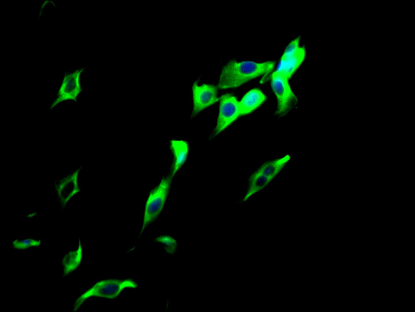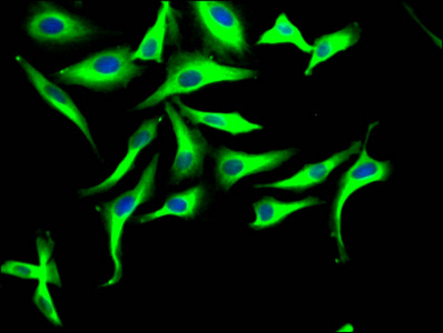 Immunofluorescence staining of NIH/3T3 cells with CSB-MA025318A0m at 1:100, counter-stained with DAPI. The cells were fixed in 4% formaldehyde, permeated by 0.2% TritonX-100, and blocked in 10% normal Goat Serum. The cells were then incubated with the antibody overnight at 4°C. Nuclear DNA was labeled in blue with DAPI. The secondary antibody was FITC-conjugated AffiniPure Goat Anti-Mouse IgG(H+L).