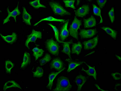 Immunofluorescence staining of Hela cells with CSB-MA025318A0m at 1:100, counter-stained with DAPI. The cells were fixed in 4% formaldehyde, permeated by 0.2% TritonX-100, and blocked in 10% normal Goat Serum. The cells were then incubated with the antibody overnight at 4°C. Nuclear DNA was labeled in blue with DAPI. The secondary antibody was FITC-conjugated AffiniPure Goat Anti-Mouse IgG(H+L).