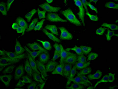 Immunofluorescence staining of A549 cells with CSB-MA025318A0m at 1:100, counter-stained with DAPI. The cells were fixed in 4% formaldehyde, permeated by 0.2% TritonX-100, and blocked in 10% normal Goat Serum. The cells were then incubated with the antibody overnight at 4°C. Nuclear DNA was labeled in blue with DAPI. The secondary antibody was FITC-conjugated AffiniPure Goat Anti-Mouse IgG(H+L).