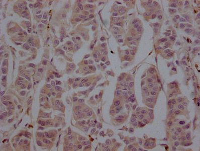 IHC image of CSB-MA025318A0m diluted at 1:200 and staining in paraffin-embedded human breast cancer performed on a Leica BondTM system. After dewaxing and hydration, antigen retrieval was mediated by high pressure in a citrate buffer (pH 6.0). Section was blocked with 10% normal goat serum 30min at 37°C Then primary antibody (1% BSA) was incubated at 4°C overnight. The primary is detected by a Goat anti-Mouse IgG labeled by HRP and visualized using 0.05% DAB.
