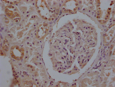 IHC image of CSB-MA025318A0m diluted at 1:200 and staining in paraffin-embedded human kidney tissue performed on a Leica BondTM system. After dewaxing and hydration, antigen retrieval was mediated by high pressure in a citrate buffer (pH 6.0). Section was blocked with 10% normal goat serum 30min at 37°C Then primary antibody (1% BSA) was incubated at 4°C overnight. The primary is detected by a Goat anti-Mouse IgG labeled by HRP and visualized using 0.05% DAB.
