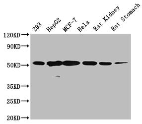 Positive WB detected in: 293 whole cell lysate, HepG2 whole cell lysate, MCF-7 whole cell lysate, Hela whole cell lysate , Rat kidney tissue , Rat stomach tissue