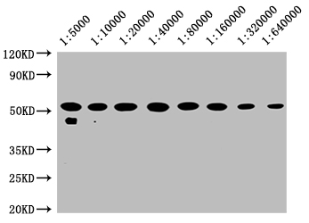 Positive WB detected in: 20μg hela whole cell lysate TUBB antibody at 1:5000, 1:10000, 1:20000, 1:40000, 1:80000, 1:160000, 1:320000, 1:640000