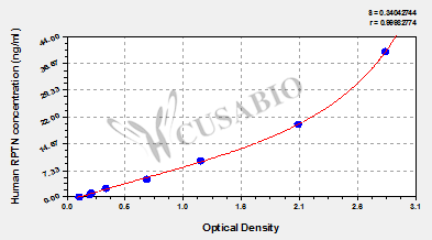 通過線性范圍來計算出實際的檢測樣本值,定量試劑盒標準曲線的相關(guān)系數(shù)R大于0.99。以CSB-E07270h(人脂聯(lián)素(ADP)ELISA Kit)為例的標準曲線。