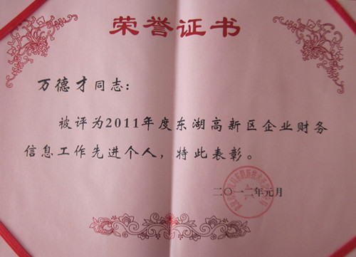 熱烈祝賀財務(wù)部萬德才同志獲評2011年度東湖高新區(qū)企業(yè)財務(wù)信息工作先進(jìn)個人