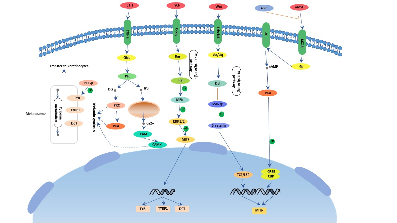 黑素生成最重要的正調(diào)節(jié)因子是MC1受體及其配體黑素皮質(zhì)肽。