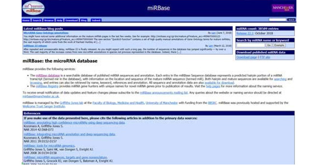 miRBase(http://www.mirbase.org/)是已發(fā)表的miRNA序列和注釋的數(shù)據(jù)庫。 miRBase數(shù)據(jù)庫中的每個(gè)條目代表miRNA轉(zhuǎn)錄物的預(yù)測發(fā)夾結(jié)構(gòu)(在數(shù)據(jù)庫中稱為mir),其具 有關(guān)于成熟miRNA序列(稱為miR)的位置和序列的信息。發(fā)夾結(jié)構(gòu)和成熟序列都可用于搜索 和瀏覽,并且還可以通過名、關(guān)鍵字、引用和注釋來檢索條目。所有序列和注釋數(shù)據(jù)也可以 下載。