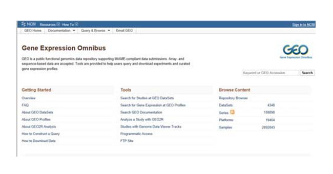 Gene Expression Omnibus(https://www.ncbi.nlm.nih.gov/geo/) ,也稱為GEO,是一個(gè)公共功能基因組數(shù)據(jù)庫,支持符合MIAME標(biāo)準(zhǔn)的數(shù)據(jù)提交,也可接受以 數(shù)組和序列為基礎(chǔ)的數(shù)據(jù)。 另外,該數(shù)據(jù)庫還提供幫助用戶查詢和下載實(shí)驗(yàn)并設(shè)計(jì)基因表達(dá) 譜的工具。