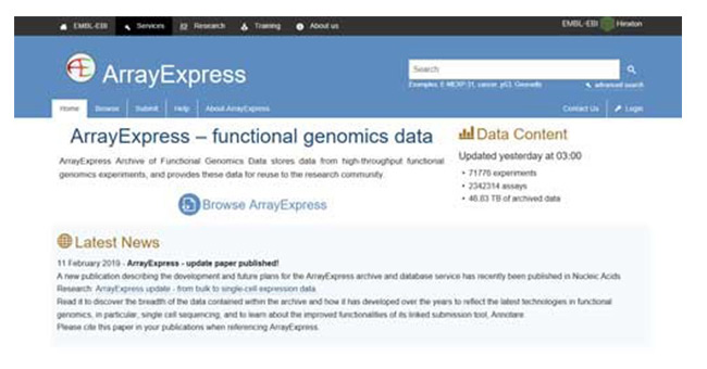 ArrayExpress(https://www.ebi.ac.uk/arrayexpress/)是科學(xué)期刊主推的軟件庫之 一,旨在歸檔芯片和測序平臺的功能基因組學(xué)數(shù)據(jù)來支持可重復(fù)的研究。為了支持可重復(fù)的 研究,他們根據(jù)芯片實(shí)驗(yàn)的最低信息(MIAME)和測序?qū)嶒?yàn)的最低信息(MINSEQE)指南來審 核數(shù)據(jù)提交。