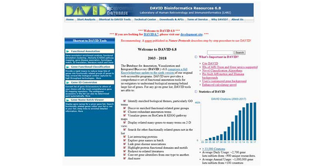 DAVID(https://david.ncifcrf.gov/)現(xiàn)在可提供一套全面的功能注釋工具, 供研究人員了解大量基因背后的生物學(xué)意義。對于任何給定的基因列表DAVID工具能夠做到以 下幾點(diǎn):確定生物學(xué)主題,特別是GO術(shù)語;發(fā)現(xiàn)功能相關(guān)基因組;群集冗余注釋術(shù)語;在 BioCarta和KEGG信號通路圖上實(shí)現(xiàn)基因可視化;在二維視圖上顯示相關(guān)的多個(gè)基因。