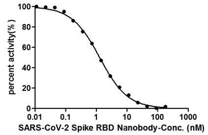 The inhibition efficacy of the SARS-CoV-2-S1-RBD /ACE2 binding was positively proportionally to this Nanobody concentrations. It showed that this Nanobody effectively inhibited the SARS-CoV-2-S1-RBD/ACE2 binding. And the IC50 of this Nanobody is 0.1074 μg/ml.