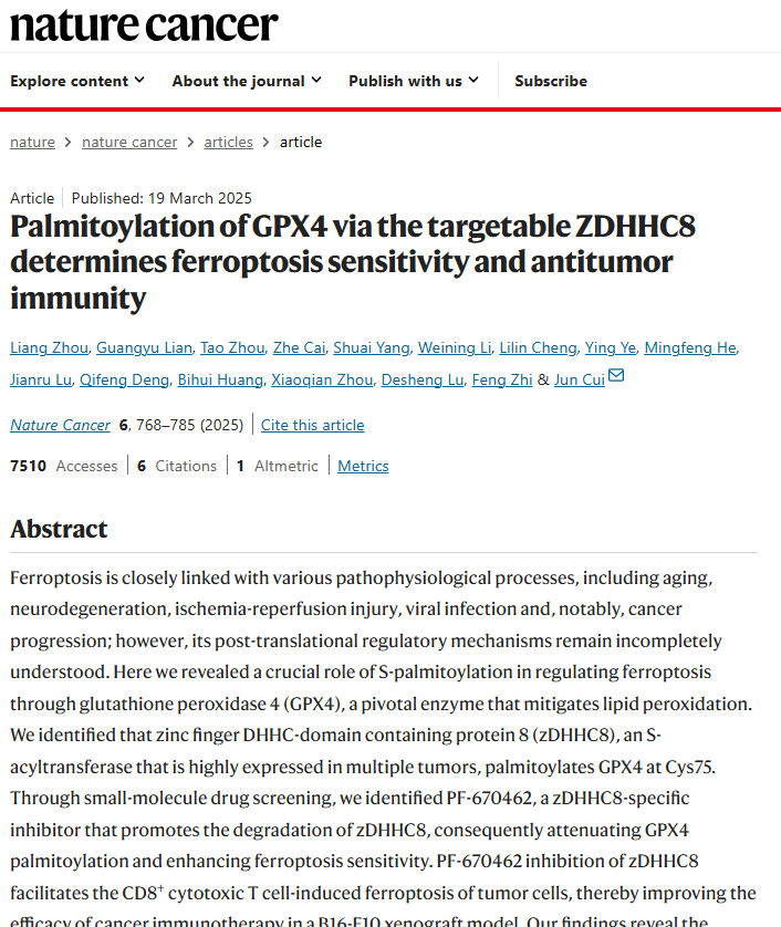 來源:Palmitoylation of GPX4 via the targetable ZDHHC8 determines ferroptosis sensitivity and antitumor immunity.Nat Cancer,2025 May