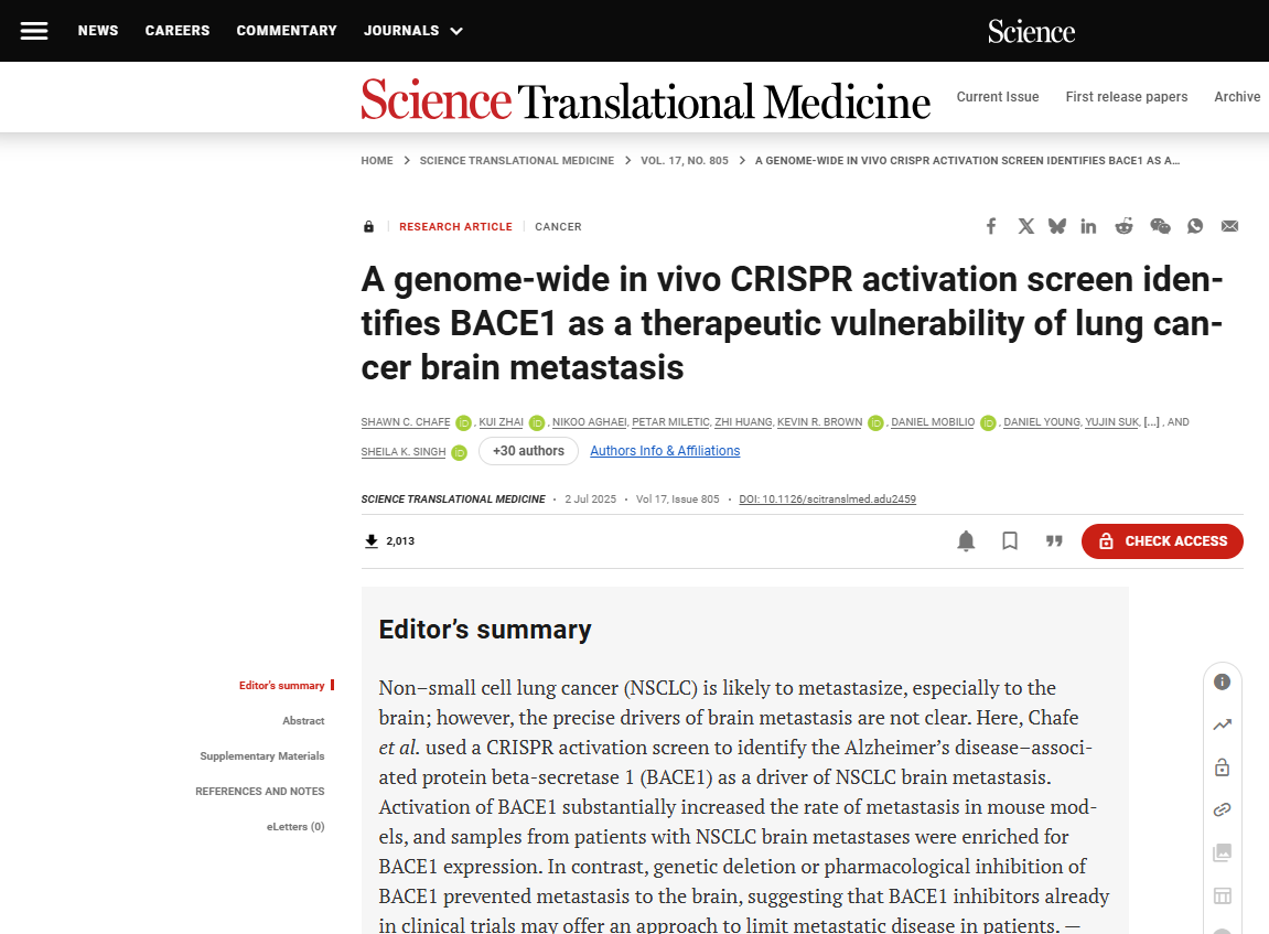 來源:A genome-wide in vivo CRISPR activation screen identifies BACE1 as a therapeutic vulnerability of lung cancer brain metastasis.Sci Transl Med,2025 Jul 02