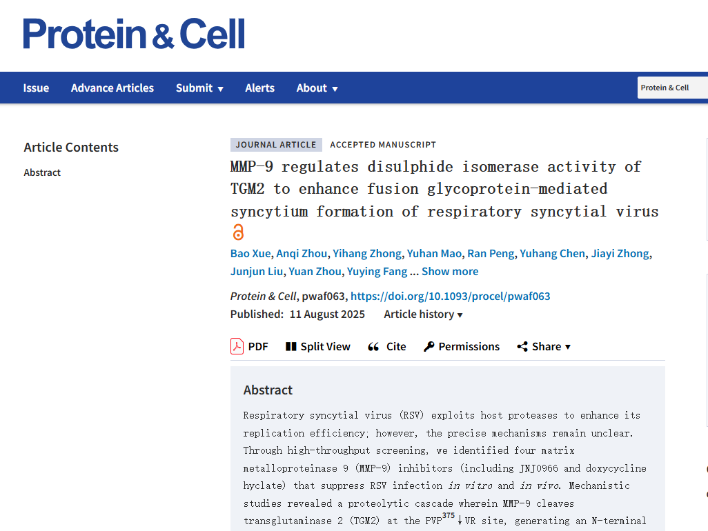 2025年8月11日,陳新文課題組在《Protein & Cell》發(fā)表研究,揭示了基質(zhì)金屬蛋白酶9(MMP-9)調(diào)控呼吸道合胞病毒(RSV)融合糖蛋白形成合胞體的新機(jī)制。研究發(fā)現(xiàn),MMP-9在PVP375↓VR位點(diǎn)切割轉(zhuǎn)谷氨酰胺酶2(TGM2),增強(qiáng)其二硫鍵異構(gòu)酶活性,催化RSV融合糖蛋白(F)中的二硫鍵重排,促進(jìn)F蛋白成熟,驅(qū)動(dòng)合胞體形成。MMP-9抑制劑在體外和體內(nèi)均能有效抑制RSV感染,降低病毒載量,緩解病理變化。MMP-9基因缺失顯著降低RSV感染能力。該研究明確了MMP-9→TGM2→F信號(hào)軸在RSV復(fù)制中的關(guān)鍵作用,并驗(yàn)證了MMP-9作為潛在治療靶點(diǎn)的可行性。
