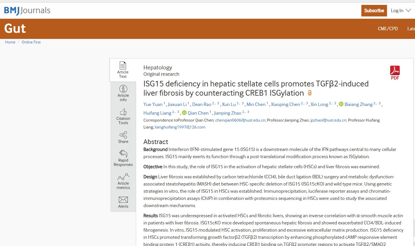 來源:ISG15 deficiency in hepatic stellate cells promotes TGFβ2-induced liver fibrosis by counteracting CREB1 ISGylation.Gut,2025 Aug 17