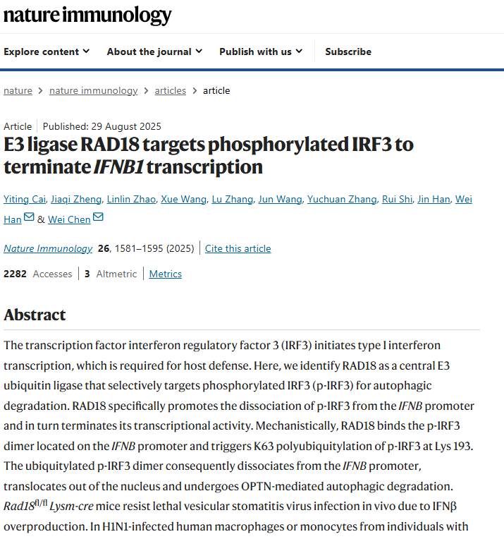 來源:E3 ligase RAD18 targets phosphorylated IRF3 to terminate IFNB1 transcription.Nat Immunol,2025 Sep