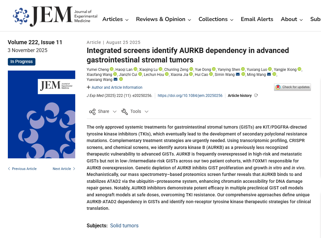 [5]Integrated Screens Identify AURKB Dependency in Advanced Gastrointestinal Stromal Tumors.J Exp Med,2025 Nov 03