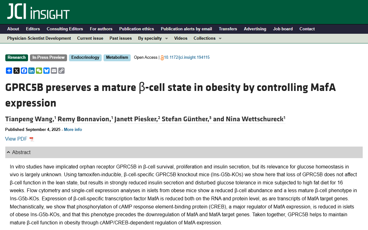 來源:GPRC5B preserves a mature β-cell state in obesity by controlling MafA expression.JCI Insight,2025 Sep 04
