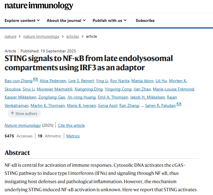 來源:STING signals to NF-κB from late endolysosomal compartments using IRF3 as an adaptor.Nat Immunol,2025 Sep 19