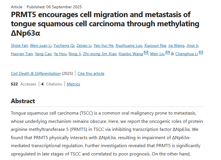 來源:PRMT5 encourages cell migration and metastasis of tongue squamous cell carcinoma through methylating ΔNp63α.Cell Death Differ,2025 Sep 06