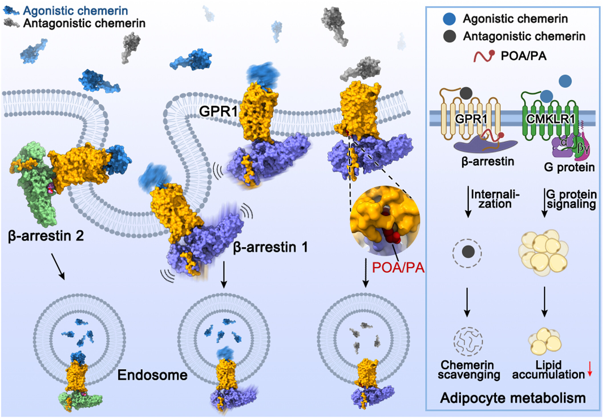 上海藥物所吳蓓麗等聯(lián)合團(tuán)隊(duì)解析GPR1與趨化素及β-arrestin1/2復(fù)合物的高分辨率結(jié)構(gòu),首次揭示無配體狀態(tài)下GPR1仍可招募β-arrestin1的“清道夫”模式,闡明其通過阻遏蛋白偏向信號(hào)和脂質(zhì)輔助內(nèi)吞精細(xì)調(diào)控趨化素穩(wěn)態(tài),并與CMKLR1協(xié)作影響脂質(zhì)代謝,為肥胖及代謝性炎癥干預(yù)提供新靶點(diǎn)與思路。推薦產(chǎn)品