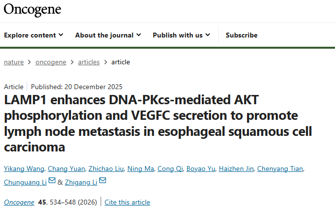來源:LAMP1 enhances DNA-PKcs-mediated AKT phosphorylation and VEGFC secretion to promote lymph node metastasis in esophageal squamous cell carcinoma.Oncogene,2026 Feb