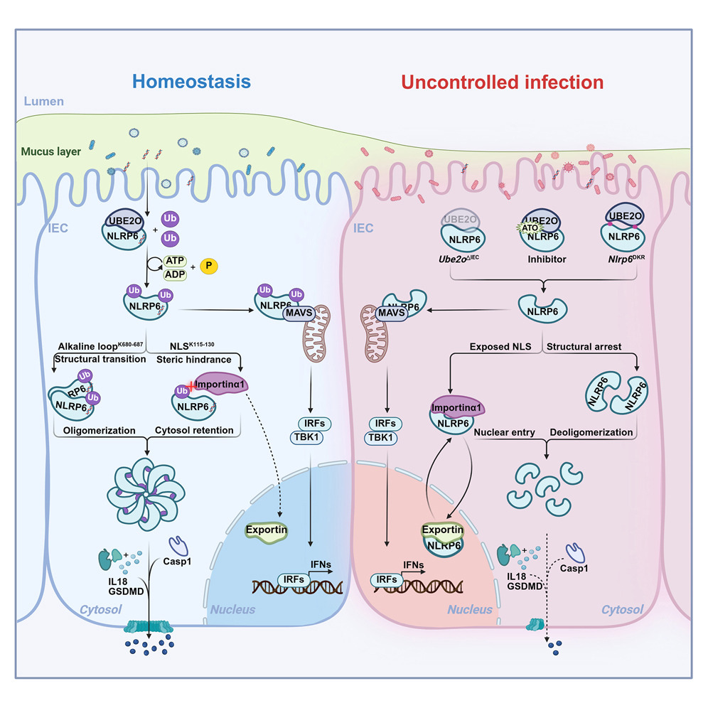中科大朱書團隊2026-01-06于Cell Host & Microbe報道,E3連接酶UBE2O催化NLRP6在LRR-K680-687與PYD-K115-130雙位點單泛素化,構象轉變+空間位阻“雙保險”促其胞質寡聚成炎癥小體。Ube2oΔIEC或位點突變小鼠IL-18分泌減少、黏液下降,對輪狀病毒和檸檬酸桿菌易感性增高;APL藥物ATO抑制UBE2O可重現(xiàn)該缺陷,提示其胃腸副作用新機制。研究首次揭示單泛素化寫入NLRP6激活程序,為靶向腸道穩(wěn)態(tài)與感染提供新思路。