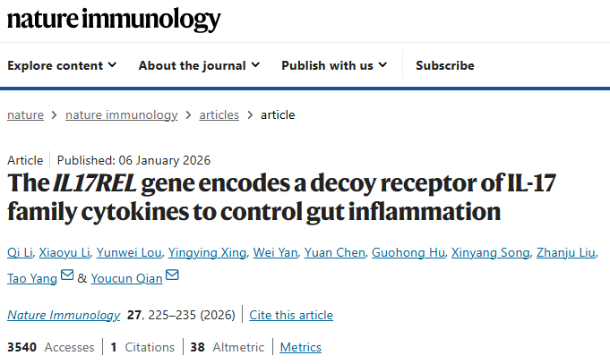 [9]The IL17REL gene encodes a decoy receptor of IL-17 family cytokines to control gut inflammation.Nat Immunol,2026 Feb