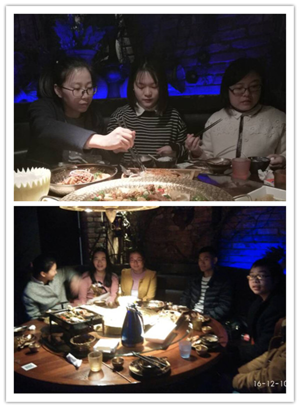 我們這桌吃貨多數(shù)是漢子,沒花多久就把一桌子肉都吃完了,還是男生多的厲害,隔壁的桌上妹子多,戰(zhàn)斗力較弱,吃了一半就撐了。不過這次我沒有嘗到羊肉串,下次再來一定要點到!最后來一張我們的大家庭合照!