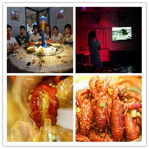 當然吃飯之前先要來點前奏,放松一下,活躍一下氣氛,也增加我們在一起相聚的時光。于是我們先去唱歌,放肆的嚎叫、溫柔的輕唱、深情的對唱,釋放著自我也拉近了我們彼此的距離。唱完歌我們就迫不及待地來到之前我們預定好的肥肥蝦莊,點了兩盆油燜大蝦,一份蝦球和一些燒烤就愉快的吃了起來。油燜大蝦蝦殼紅亮酥脆,蝦肉白嫩可口,整體麻、辣、香。讓人吃完一個想著下一個,根本停不下來。吃到最后一只蝦時,大家都不好意思獨享這只美味,相互謙讓,于是提議讓開車遠道而來的輝哥享用,充分展示了本團隊團結互助,關愛他人的優(yōu)秀傳統(tǒng)美德(= ̄ω ̄=)。