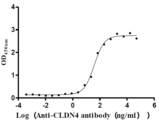 Activity: Measured by its binding ability in a functional ELISA. Immobilized Human CLDN4 at 5 μg/ml can bind Anti-CLDN4 recombinant antibody (CSB-RA005506MA1HU), the EC50 is 29.56-50.75 ng/mL