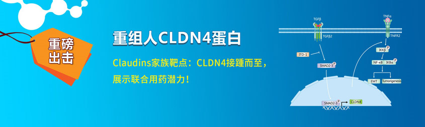 Claudin 4( CLDN4 )是一種緊密連接蛋白,是Claudin 家族的一員,Claudin 蛋白均由4個(gè)跨膜結(jié)構(gòu)域構(gòu)成,N端和C端均位于細(xì)胞內(nèi)部,細(xì)胞膜外有2個(gè)長度不等的環(huán),可以和臨近其他同類型的環(huán)相接觸構(gòu)成細(xì)胞間的緊密連接. 而且CLDN4的結(jié)構(gòu)高度保守,從線蟲到人類都十分相似.當(dāng)Claudin蛋白發(fā)生變化時(shí)將影響細(xì)胞間的通透性進(jìn)一步引起多種疾病的發(fā)生.研究報(bào)道CLDN4 在卵巢癌、前列腺癌、乳腺癌、胰腺癌、腸道癌等多種腫瘤中表達(dá)上調(diào),并且作為一種癌基因介導(dǎo)癌癥的發(fā)生。